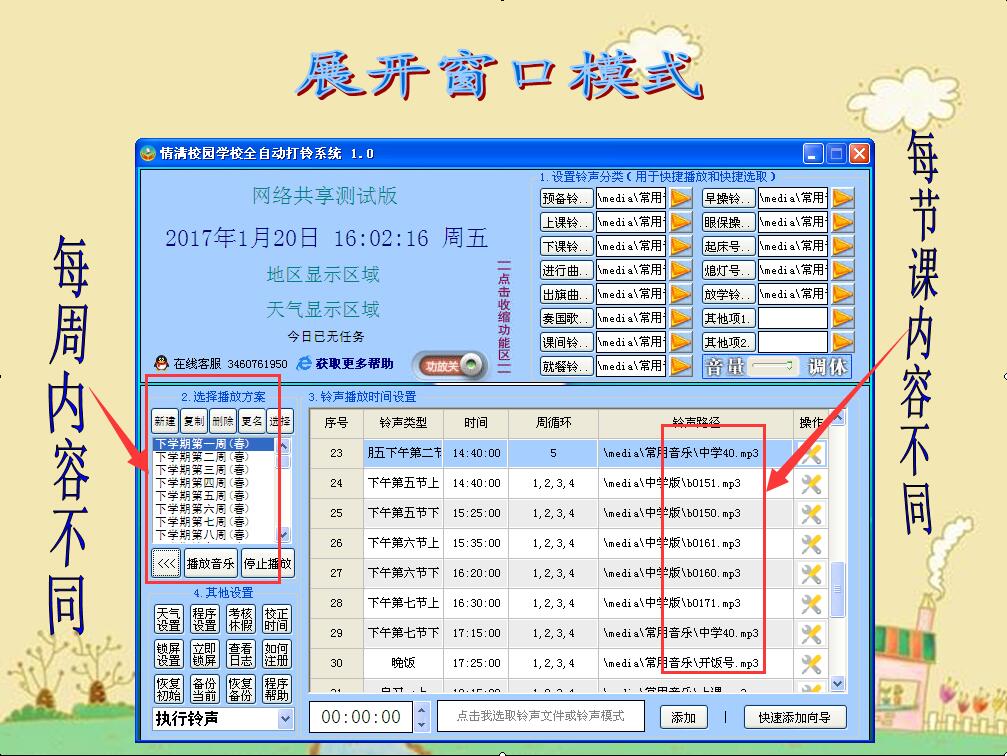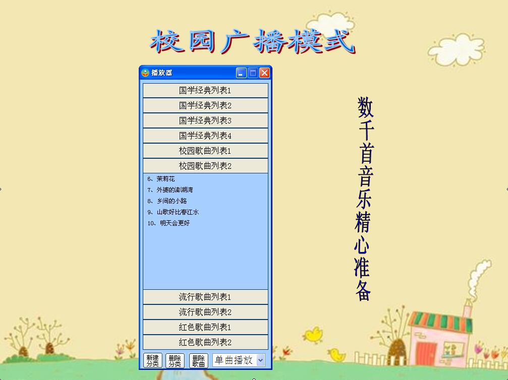 创建的列表请放到这两个文件夹里,如果只创建一个列表,且每天、每周内容都不变,请放到常用音乐文件夹下,如果希望每周都播放不一样的音乐列表,请创建40个,并以a01,a02....a20,b01,b02....b20为序号+文件名命名。比如a01红色歌曲列表.play,a02红色歌曲列表.play。。。。,除序号不变外,文件名要一样,编排到电子表格中“%红色歌曲列表.play”,这个%就会随着周次的变化而自动变化,实现自动轮播的目的。【详细】