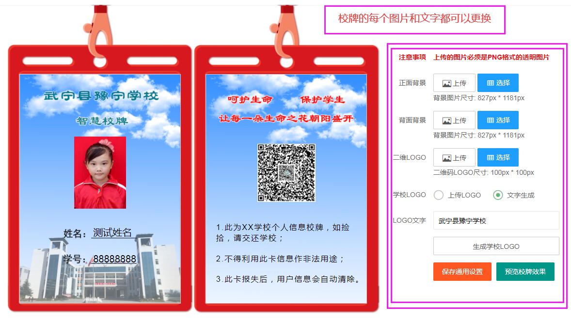 利用后台学生信息(学校、班级、姓名、学号等),加上校管理员上传的模板元素(学校背景照片、logo以及校训校风等,设计一张,全校同步),可以自动批量设计出学生的名片校牌,个人信息可以动态更新(如家长联系方式,居住地更换,年级自动升年级等,信息发生变化后,不必要重新更换校牌),电话和住址通过扫码无法直接联系到家长,而是联系班主任的电话,不会暴露学生的关键信息,有效防止利用样牌诈骗事件的发生。