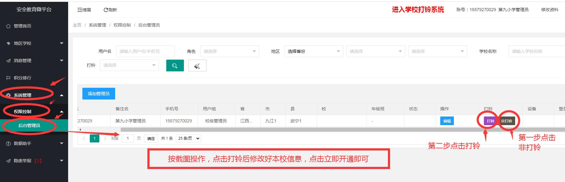 请登录安全教育微平台(http://wpt.qmxyls.com/mryb_@_jy.php),点击系统管理-权限控制-后台管理员;点击“非打铃”,打铃的颜色从紫色变成了绿色,然后点击绿色的“打铃”按钮,弹出页面,修改信息后点击“立即开通”,然后刷新页面即已完成了更改。