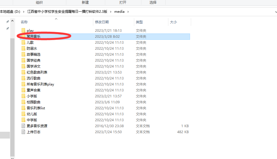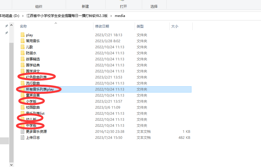 *代表每周变化的铃声,如在第一周,*就代表01,在第二周,*就代表02,以此类推,该铃声是一个系列的音乐,放在“幼儿版”“小学版”“中学版”的文件夹下,以实现铃声随着时间而不断变化的功能,如果学校希望校园播放“每周一歌”,则可以将相关的音乐复制在相应的文件夹中,然后按照教程进行编排。