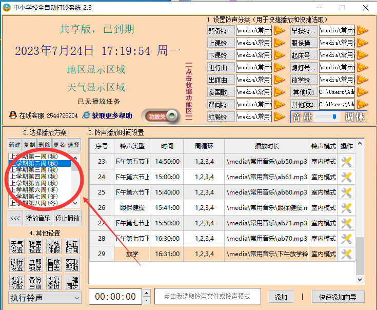 正常情况下,软件有自动切换功能,每到星期一会自动跳转“下一周”的打铃方案,铃声改变是正常的(在软件界面直接编排时间的只能使用一周)。