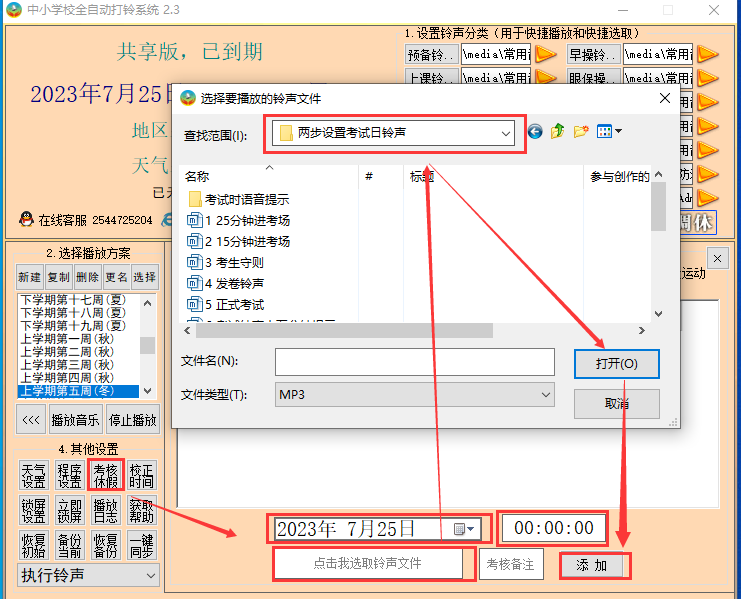“考核休假—考核设置”即可编排指定日期的考试时间,在考试日,其它铃声不会响。
